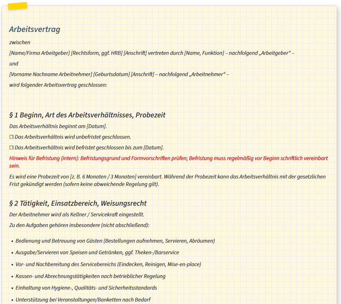 Muster-Arbeitsvertrag Kellner / Servicekraft