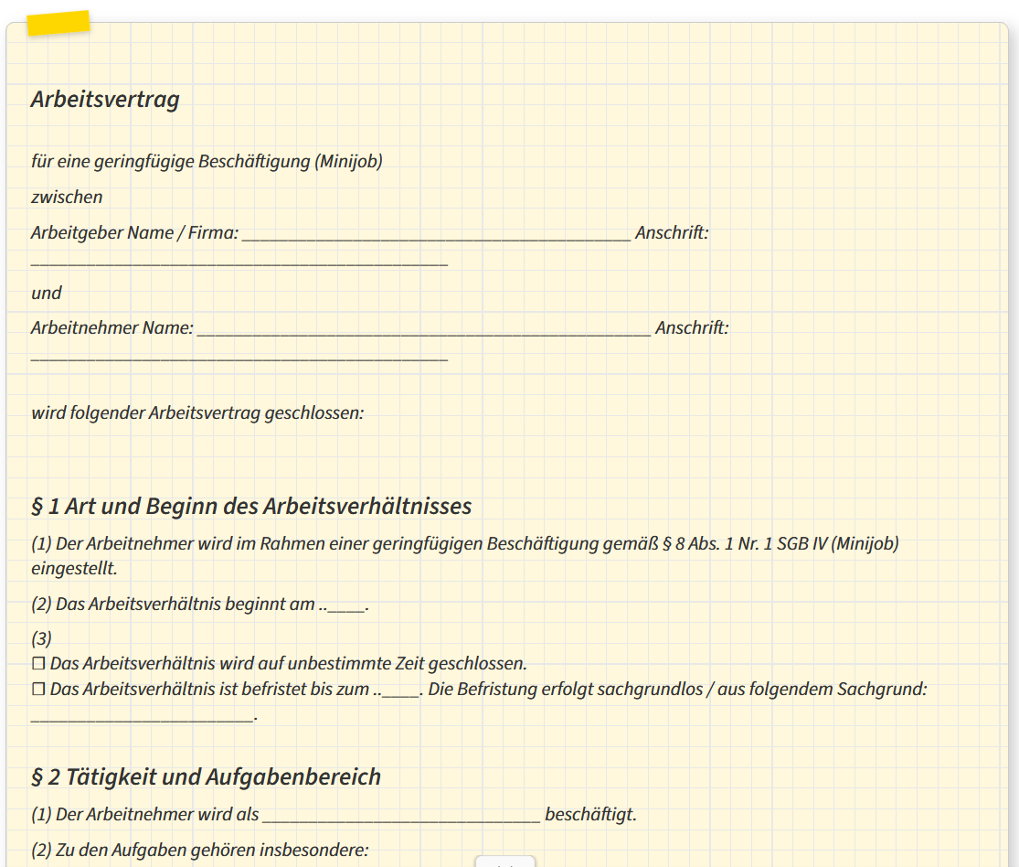 Dieses Arbeitsvertrag-Muster für einen Minijob dient als unverbindliche Orientierungshilfe für Arbeitgeber und Arbeitnehmer. Es zeigt, welche Regelungen in einem Arbeitsvertrag für eine geringfügige Beschäftigung typischerweise enthalten sind.