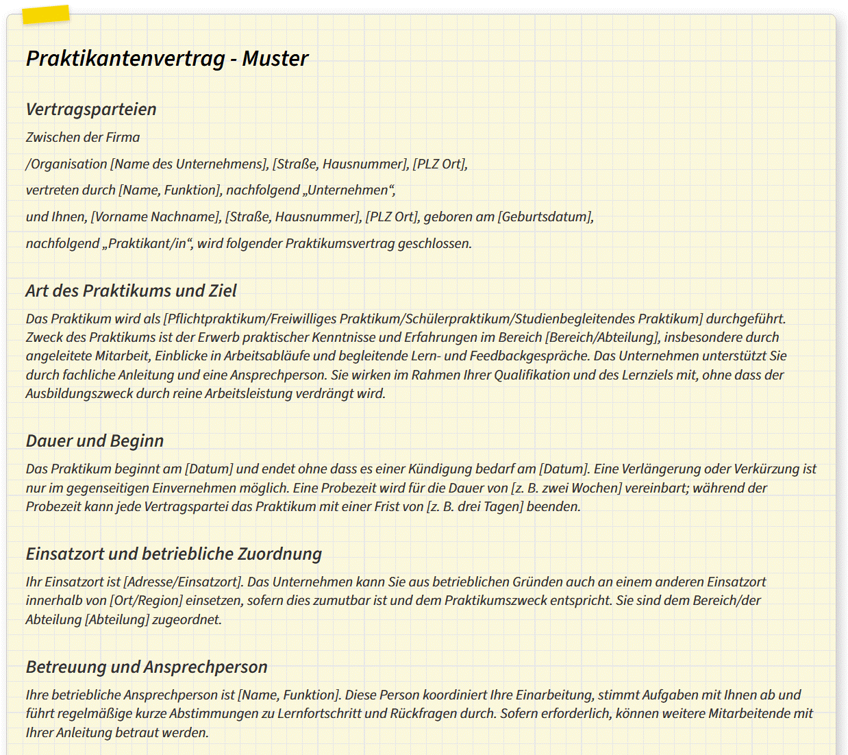 Der folgende Text ist ein unverbindliches Vertragsmuster und dient als Beispiel, wie ein Praktikumsvertrag formuliert sein kann. Er ersetzt keine individuelle Prüfung des Einzelfalls und stellt keine Rechtsberatung dar. Sie sollten den Inhalt vor Verwendung an Ihre konkrete Situation anpassen und bei Bedarf fachkundigen Rat einholen.