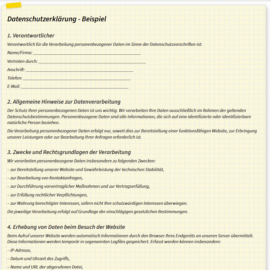 Dieses Dokument ist ein Vertragsmuster bzw. Beispieltext für eine allgemeine Datenschutzerklärung. Es dient als Formulierungshilfe und muss vor der Verwendung an Ihre konkrete Website, Ihr Unternehmen und Ihre tatsächlichen Datenverarbeitungen angepasst werden. Es ersetzt keine Rechtsberatung; für die rechtliche Prüfung und vollständige Umsetzung der datenschutzrechtlichen Anforderungen sind Sie selbst verantwortlich.