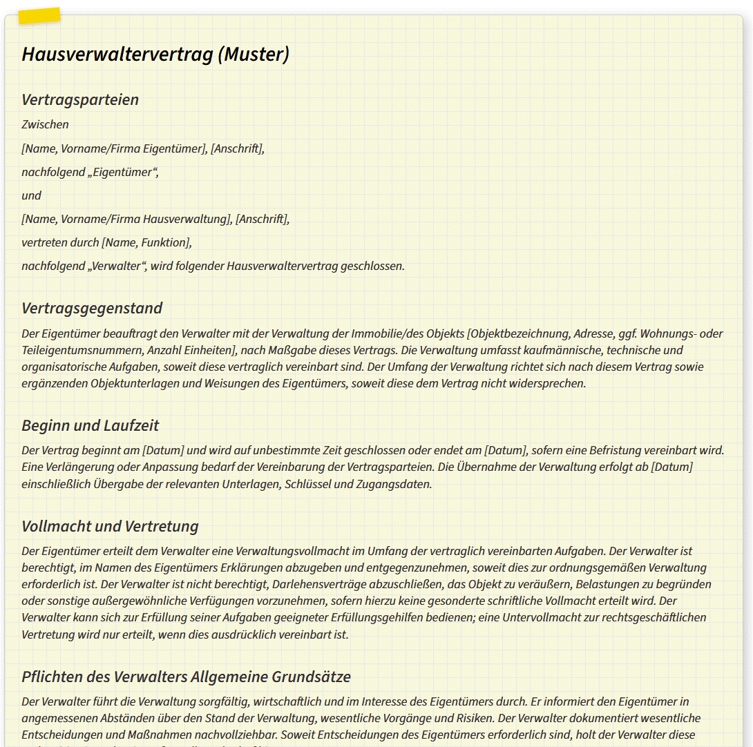 Ein umfassender Hausverwaltervertrag sollte folgende Paragraphen enthalten: