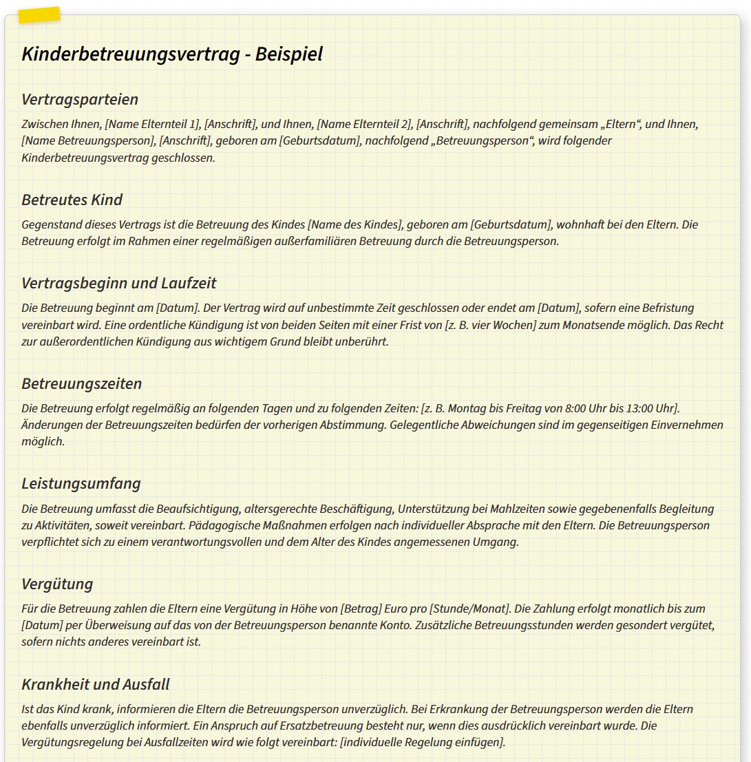 Der folgende Text ist ein unverbindliches Vertragsmuster und dient als Beispiel, wie ein Kinderbetreuungsvertrag formuliert werden kann. Er ersetzt keine individuelle Prüfung des Einzelfalls und stellt keine Rechtsberatung dar. Sie sollten den Inhalt vor Verwendung an Ihre konkrete Situation anpassen und bei Bedarf fachkundigen Rat einholen.