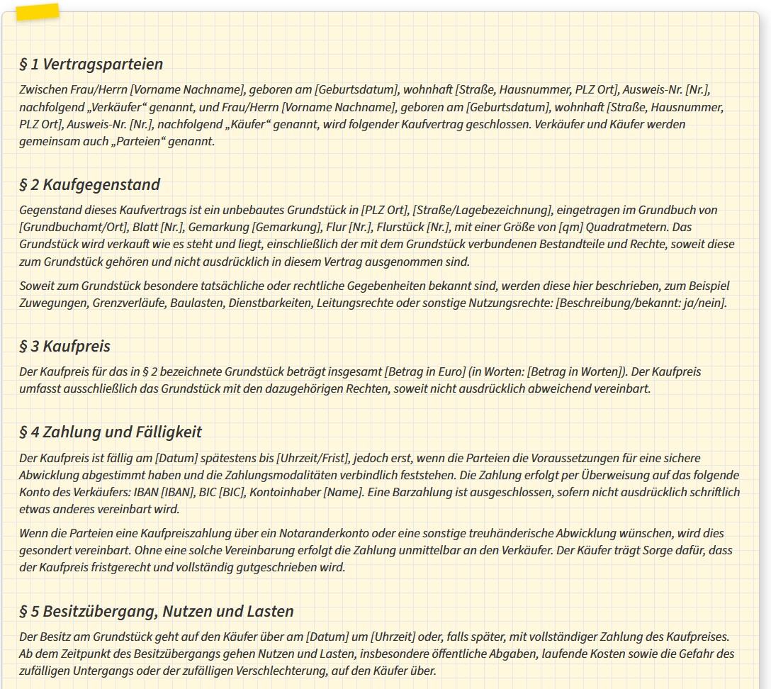 Bei Grundstückskaufverträgen ist die notarielle Beurkundung in der Regel erforderlich, damit die Vereinbarung wirksam umgesetzt werden kann. Dieses Muster ersetzt daher keinen Notarvertrag, sondern dient in erster Linie als strukturierte Vorbereitung und als Orientierung für die Zusammenstellung der notwendigen Informationen.